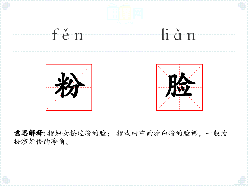 指妇女搽过粉的脸; 指戏曲中面涂白粉的脸谱,一般为扮演奸佞的净角。