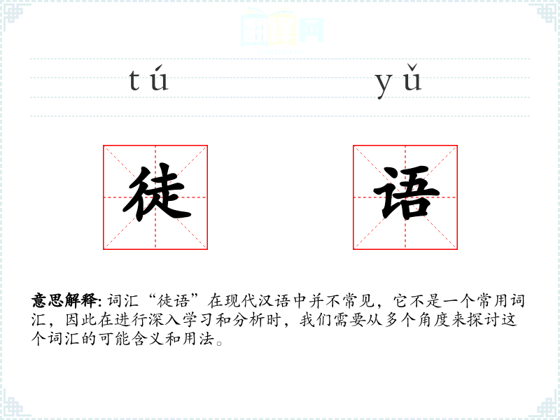 词汇“徒语”在现代汉语中并不常见,它不是一个常用词汇,因此在进行深入学习和分析时,我们需要从多个角度来探讨这个词汇的可能含义和用法。