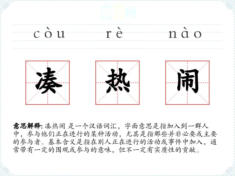 - 文学:在文学作品中,这个词可能用来描述一个角色对某个**的好奇心或社交行为,如“他只是来凑热闹的,没想到却卷入了更大的风波。”