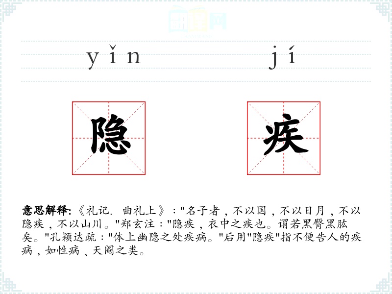 《礼记.曲礼上》﹕"名子者﹐不以国﹐不以日月﹐不以隐疾﹐不以山川。"郑玄注﹕"隐疾﹐衣中之疾也。谓若黑臀黑肱矣。"孔颖达疏﹕"体上幽隐之处疾病。"后用"隐疾"指不便告人的疾病﹐如性病﹑天阉之类。