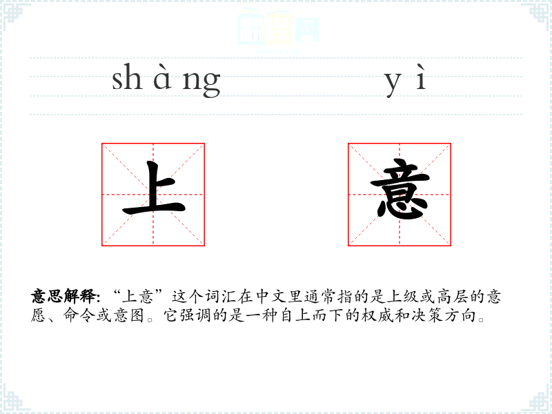 “上意”这个词汇在中文里通常指的是上级或高层的意愿、命令或意图。它强调的是一种自上而下的权威和决策方向。