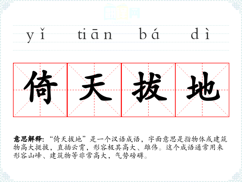 “倚天拔地”是一个汉语成语,字面意思是指物体或建筑物高大挺拔,直插云霄,形容极其高大、雄伟。这个成语通常用来形容山峰、建筑物等非常高大,气势磅礴。