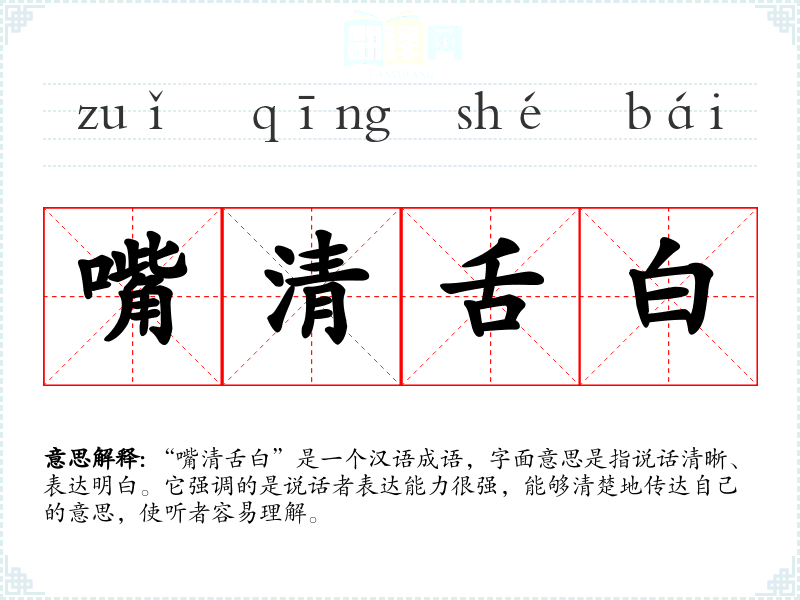 “嘴清舌白”是一个汉语成语,字面意思是指说话清晰、表达明白。它强调的是说话者表达能力很强,能够清楚地传达自己的意思,使听者容易理解。