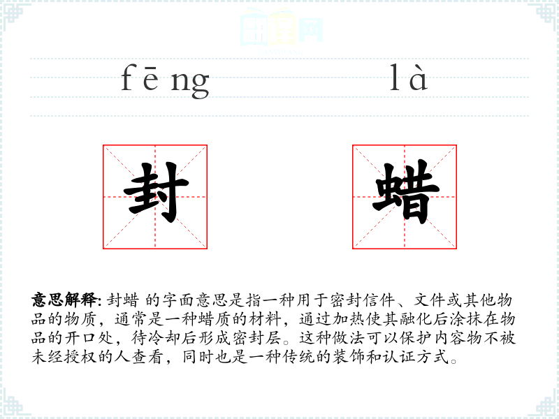 封蜡 的字面意思是指一种用于密封信件、文件或其他物品的物质,通常是一种蜡质的材料,通过加热使其融化后涂抹在物品的开口处,待冷却后形成密封层。这种做法可以保护内容物不被未经授权的人查看,同时也是一种传统的装饰和认证方式。