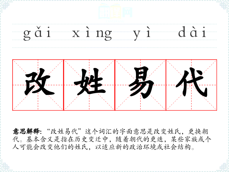 “改姓易代”这个词汇的字面意思是改变姓氏,更换朝代。基本含义是指在历史变迁中,随着朝代的更迭,某些家族或个人可能会改变他们的姓氏,以适应新的政治环境或社会结构。