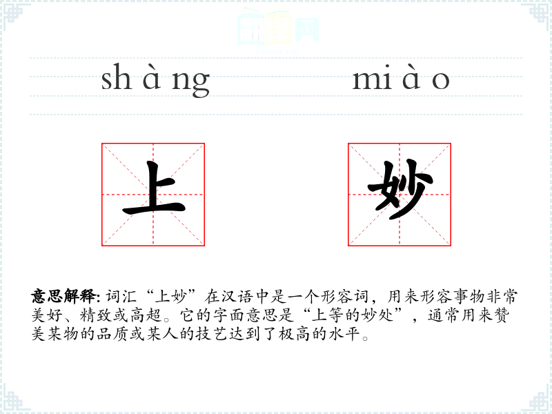 词汇“上妙”在汉语中是一个形容词,用来形容事物非常美好、精致或高超。它的字面意思是“上等的妙处”,通常用来赞美某物的品质或某人的技艺达到了极高的水平。