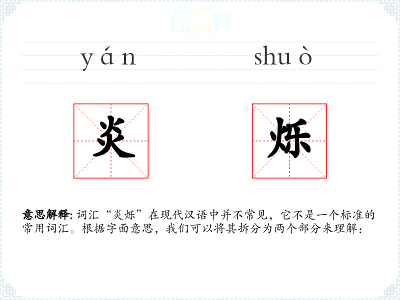 词汇“炎烁”在现代汉语中并不常见,它不是一个标准的常用词汇。根据字面意思,我们可以将其拆分为两个部分来理解: