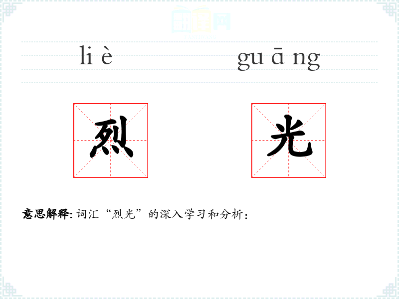 “烈光”由“烈”和“光”两个字组成。“烈”字有强烈、猛烈的意思,“光”字指光线。在古代文献中,“烈光”常用来形容太阳或火焰的强烈光芒。