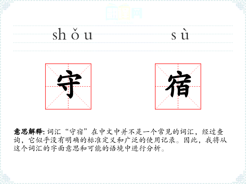 词汇“守宿”在中文中并不是一个常见的词汇,经过查询,它似乎没有明确的标准定义和广泛的使用记录。因此,我将从这个词汇的字面意思和可能的语境中进行分析。