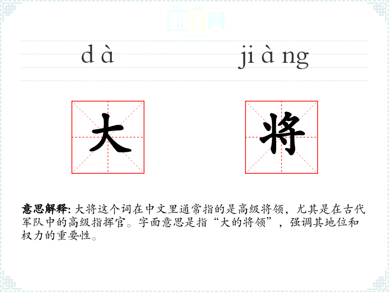 "大将"的意思解释、大将是什么意思由翻译网汉语词典查词提供。