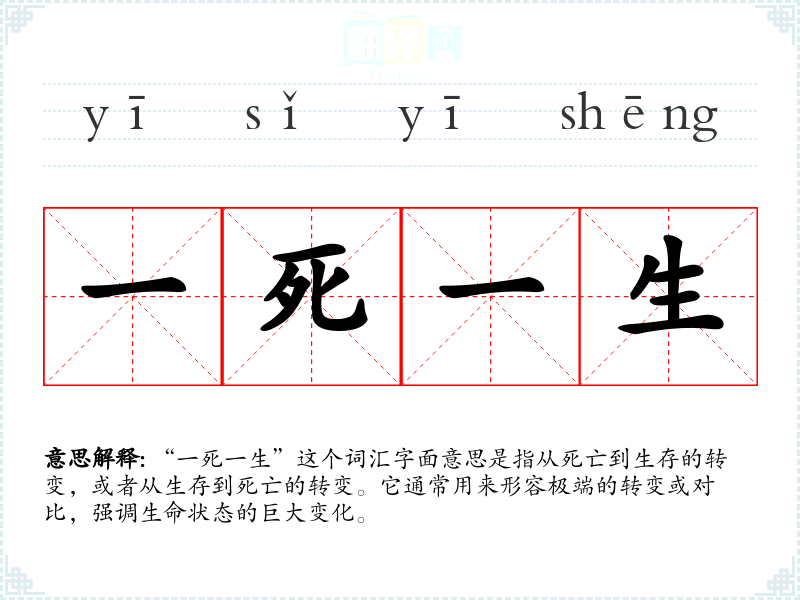“一死一生”这个词汇字面意思是指从死亡到生存的转变,或者从生存到死亡的转变。它通常用来形容极端的转变或对比,强调生命状态的巨大变化。