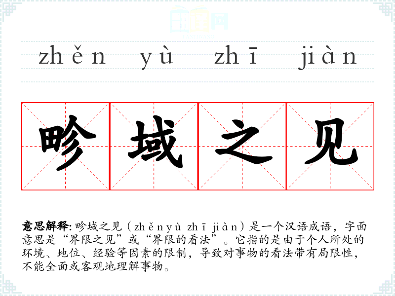 畛域之见(zhěn yù zhī jiàn)是一个汉语成语,字面意思是“界限之见”或“界限的看法”。它指的是由于个人所处的环境、地位、经验等因素的限制,导致对事物的看法带有局限性,不能全面或客观地理解事物。