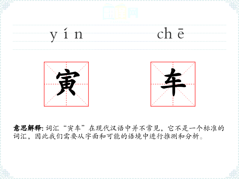 词汇“寅车”在现代汉语中并不常见,它不是一个标准的词汇,因此我们需要从字面和可能的语境中进行推测和分析。