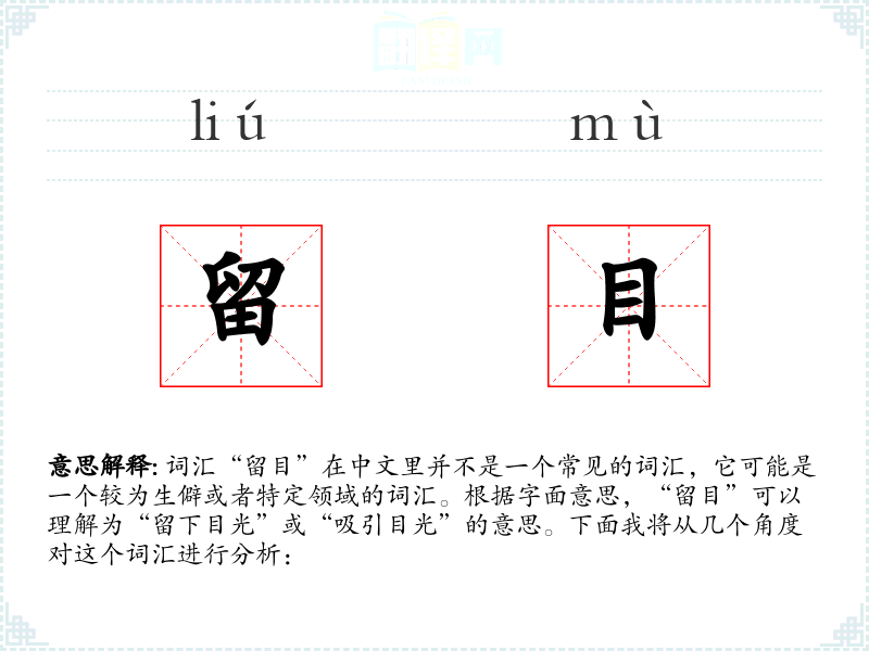 词汇“留目”在中文里并不是一个常见的词汇,它可能是一个较为生僻或者特定领域的词汇。根据字面意思,“留目”可以理解为“留下目光”或“吸引目光”的意思。下面我将从几个角度对这个词汇进行分析: