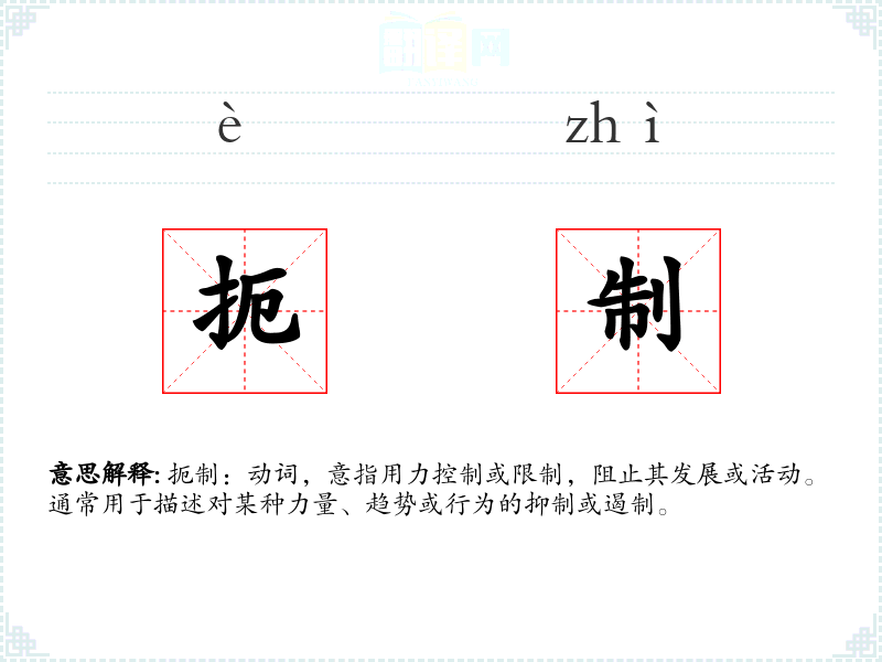 扼制:动词,意指用力控制或限制,阻止其发展或活动。通常用于描述对某种力量、趋势或行为的抑制或遏制。
