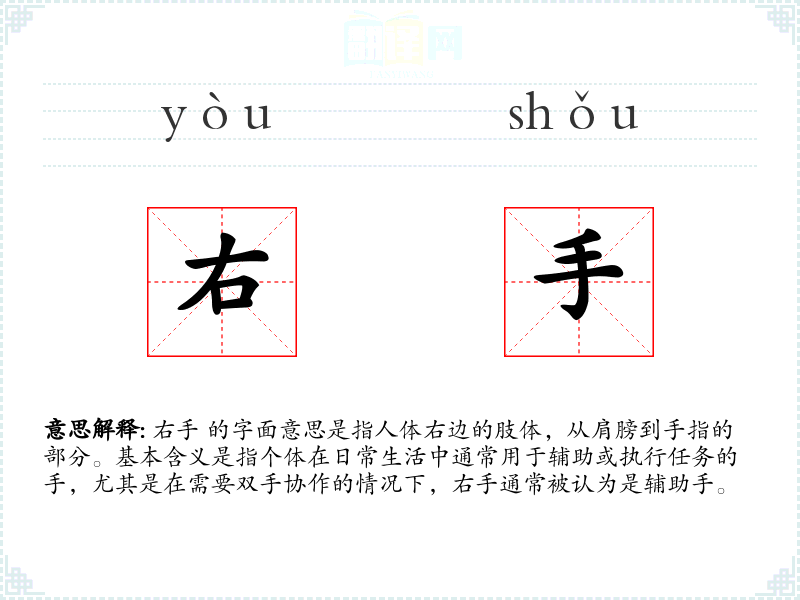 右手 的字面意思是指人体右边的肢体,从肩膀到手指的部分。基本含义是指个体在日常生活中通常用于辅助或执行任务的手,尤其是在需要双手协作的情况下,右手通常被认为是辅助手。