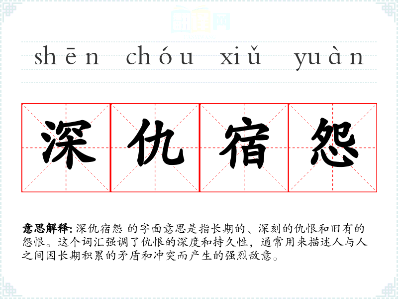 在传统文化中,深仇宿怨** 常常与家族荣誉、忠诚和复仇等主题相关联。在现代社会,这个词汇可能被用来描述因历史、政治或经济原因而产生的长期冲突。