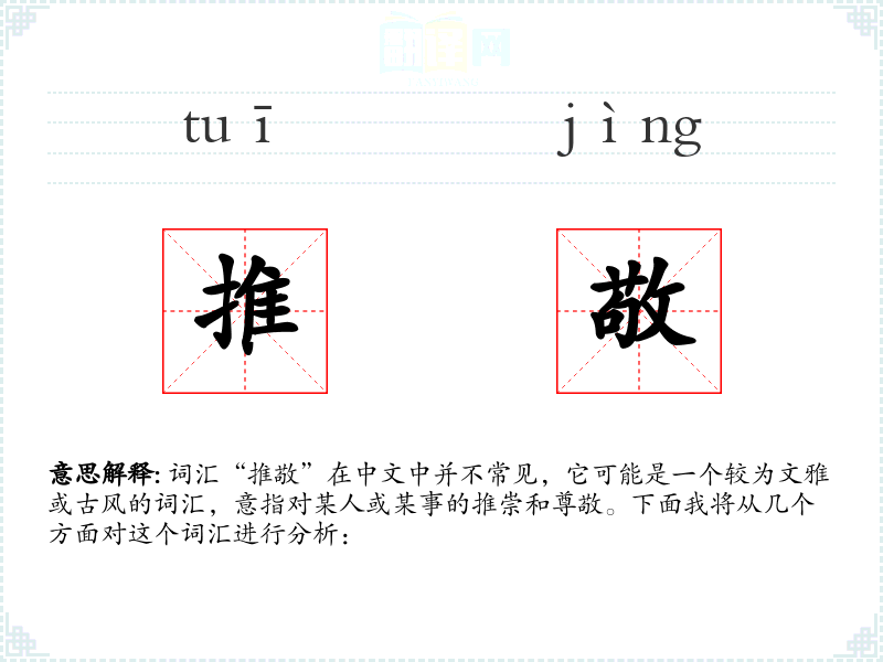 词汇“推敬”在中文中并不常见,它可能是一个较为文雅或古风的词汇,意指对某人或某事的推崇和尊敬。下面我将从几个方面对这个词汇进行分析: