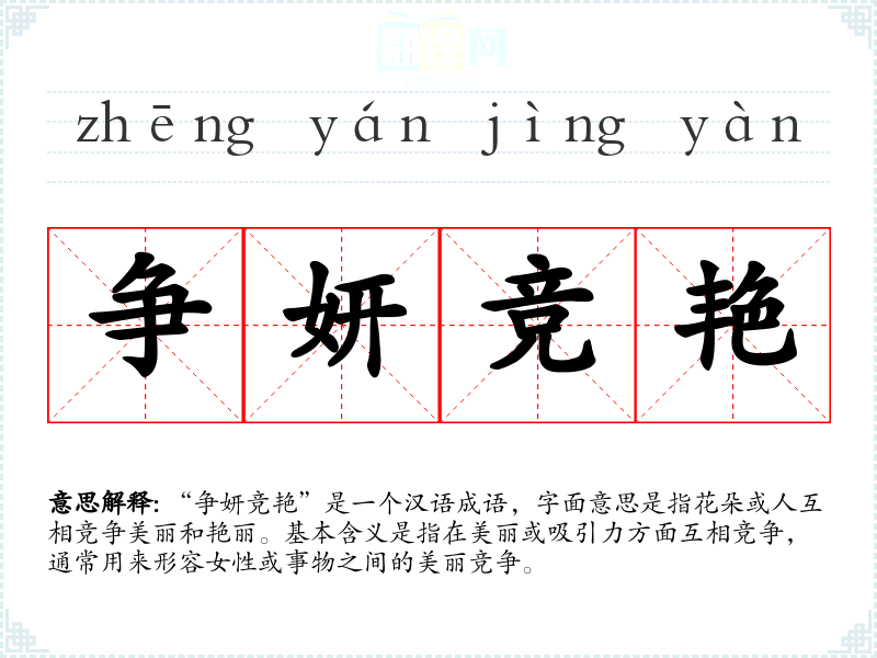“争妍竞艳”是一个汉语成语,字面意思是指花朵或人互相竞争美丽和艳丽。基本含义是指在美丽或吸引力方面互相竞争,通常用来形容女性或事物之间的美丽竞争。