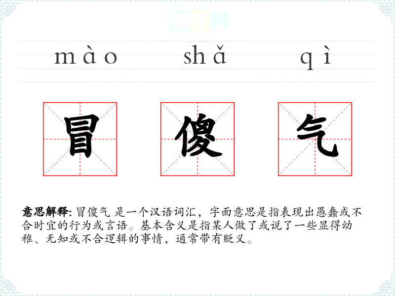 冒傻气 是一个汉语词汇,字面意思是指表现出愚蠢或不合时宜的行为或言语。基本含义是指某人做了或说了一些显得幼稚、无知或不合逻辑的事情,通常带有贬义。