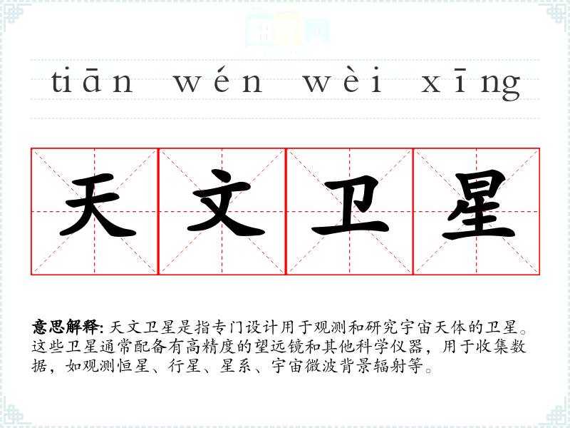 “天文卫星”一词由“天文”和“卫星”两个词组成。“天文”源自拉丁语“astronomia”,意为“星的研究”;“卫星”源自拉丁语“satelles”,意为“随从”。随着航天技术的发展,这个词汇逐渐被用于描述在太空中执行天文观测任务的设备。