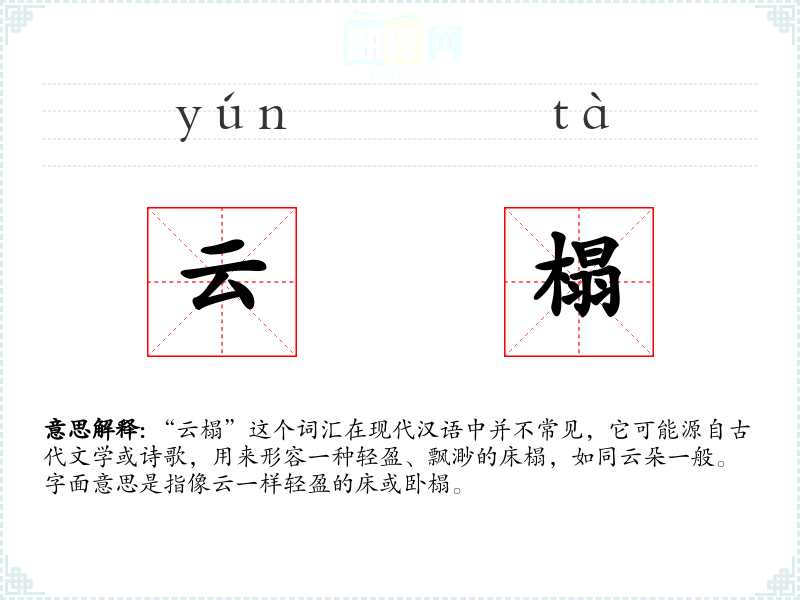 “云榻”这个词汇在现代汉语中并不常见,它可能源自古代文学或诗歌,用来形容一种轻盈、飘渺的床榻,如同云朵一般。字面意思是指像云一样轻盈的床或卧榻。