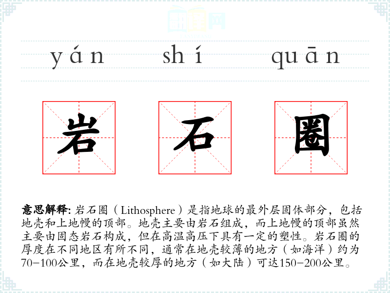 - 反义词:软流圈(Asthenosphere),指的是岩石圈下方的部分,具有较高的塑性。