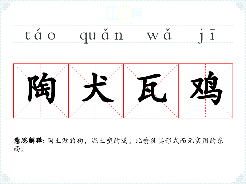 陶土做的狗,泥土塑的鸡。比喻徒具形式而无实用的东西。