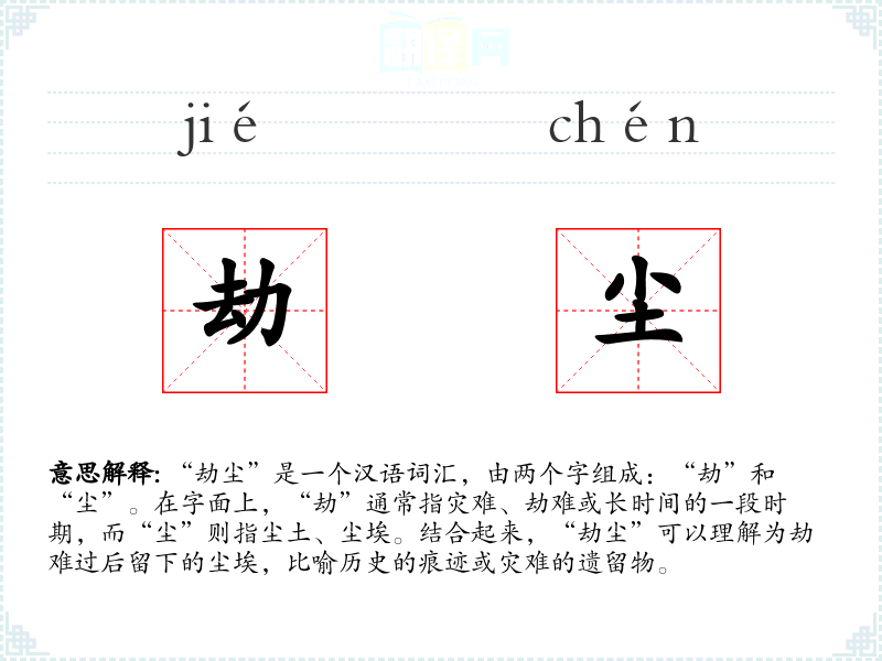 “劫”字源自**术语,指一段极长的时间,后来引申为灾难、劫难。“尘”字则源自古代对尘土的称呼。两个字结合,形成了“劫尘”这个词汇,用来形容灾难后的遗留状态。