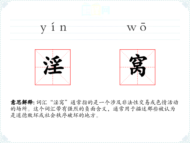 词汇“淫窝”通常指的是一个涉及非法性交易或色情活动的场所。这个词汇带有强烈的负面含义,通常用于描述那些被认为是道德败坏或社会秩序破坏的地方。