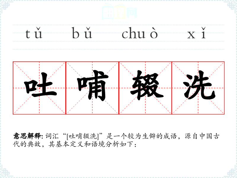 词汇“[吐哺辍洗]”是一个较为生僻的成语,源自**古代的典故,其基本定义和语境分析如下: