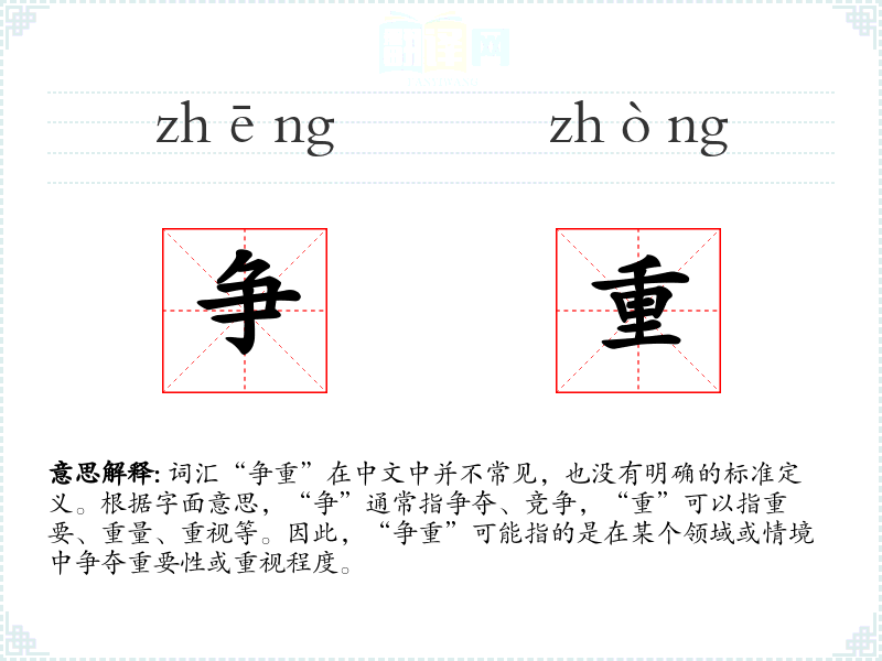 词汇“争重”在中文中并不常见,也没有明确的标准定义。根据字面意思,“争”通常指争夺、竞争,“重”可以指重要、重量、重视等。因此,“争重”可能指的是在某个领域或情境中争夺重要性或重视程度。