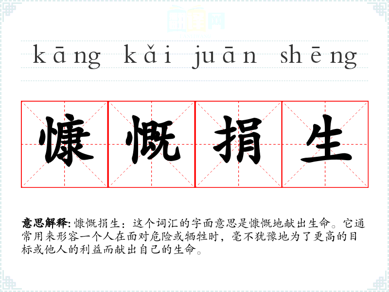 - 词源:这个词由“慷慨”和“捐生”两个词组成。“慷慨”源自古代汉语,意为大方、不吝啬;“捐生”意为献出生命。