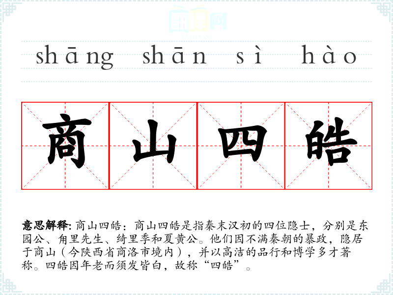 商山四皓:商山四皓是指秦末汉初的四位隐士,分别是东园公、甪里先生、绮里季和夏黄公。他们因不满秦朝的暴政,隐居于商山(今陕西省商洛市境内),并以高洁的品行和博学多才著称。四皓因年老而须发皆白,故称“四皓”。