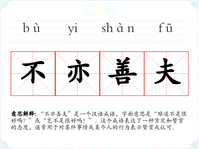 “不亦善夫”是一个汉语成语,字面意思是“难道不是很好吗?”或“岂不是很好吗?”。这个成语表达了一种肯定和赞赏的态度,通常用于对某件事情或某个人的行为表示赞赏或认可。