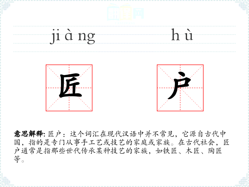 匠户:这个词汇在现代汉语中并不常见,它源自古代**,指的是专门从事手工艺或技艺的家庭或家族。在古代社会,匠户通常是指那些世代传承某种技艺的家族,如铁匠、木匠、陶匠等。