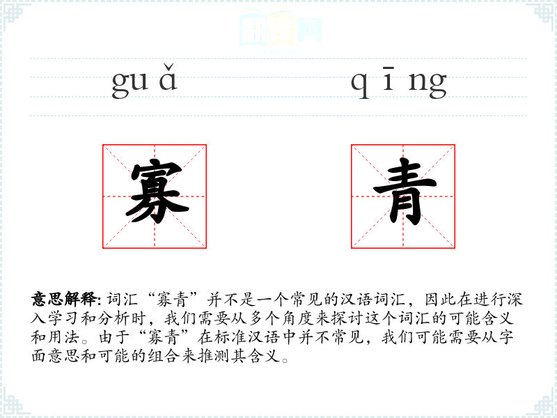 词汇“寡青”并不是一个常见的汉语词汇,因此在进行深入学习和分析时,我们需要从多个角度来探讨这个词汇的可能含义和用法。由于“寡青”在标准汉语中并不常见,我们可能需要从字面意思和可能的组合来推测其含义。