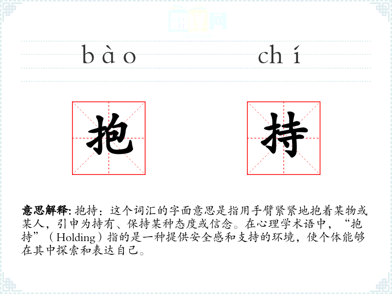 抱持:这个词汇的字面意思是指用手臂紧紧地抱着某物或某人,引申为持有、保持某种态度或信念。在心理学术语中,“抱持”(Holding)指的是一种提供安全感和支持的环境,使个体能够在其中探索和表达自己。