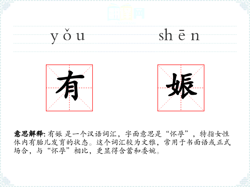 - 专业领域:在医学或生物学领域,可能会使用“有娠”来指代怀孕状态,尤其是在需要强调文雅或正式性的场合。