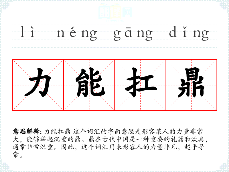 这个词汇给人以强烈的视觉和情感联想,想象一个强壮的人举起沉重的鼎,充满了力量和威严。它激发了对力量和能力的敬畏和向往。