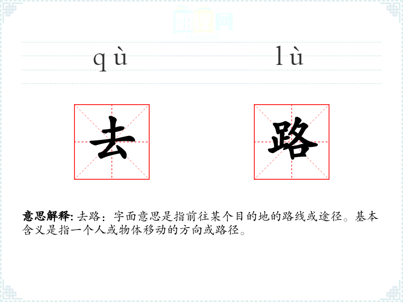 去路:字面意思是指前往某个目的地的路线或途径。基本含义是指一个人或物体移动的方向或路径。