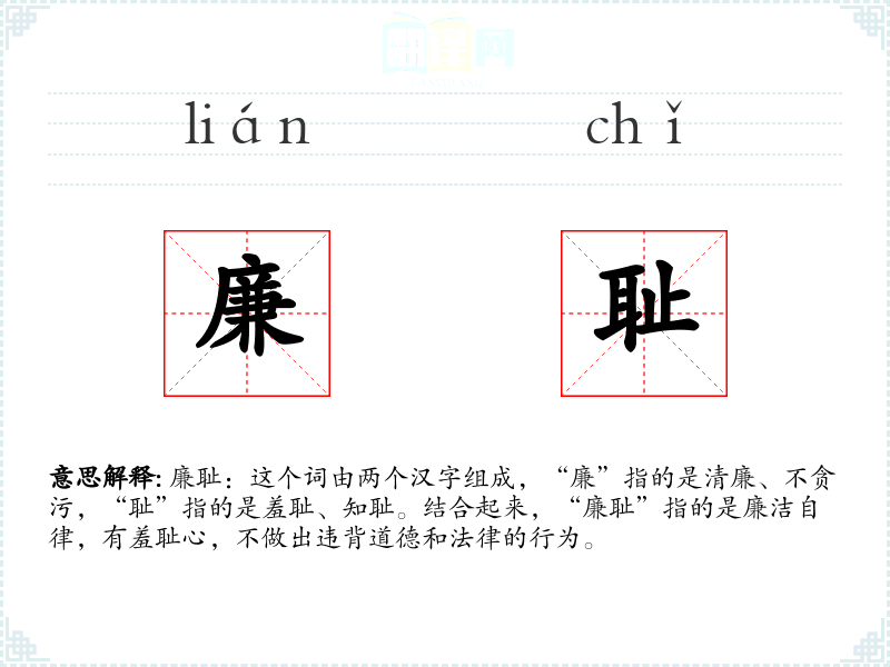 廉耻:这个词由两个汉字组成,“廉”指的是清廉、不贪污,“耻”指的是羞耻、知耻。结合起来,“廉耻”指的是廉洁自律,有羞耻心,不做出违背道德和法律的行为。