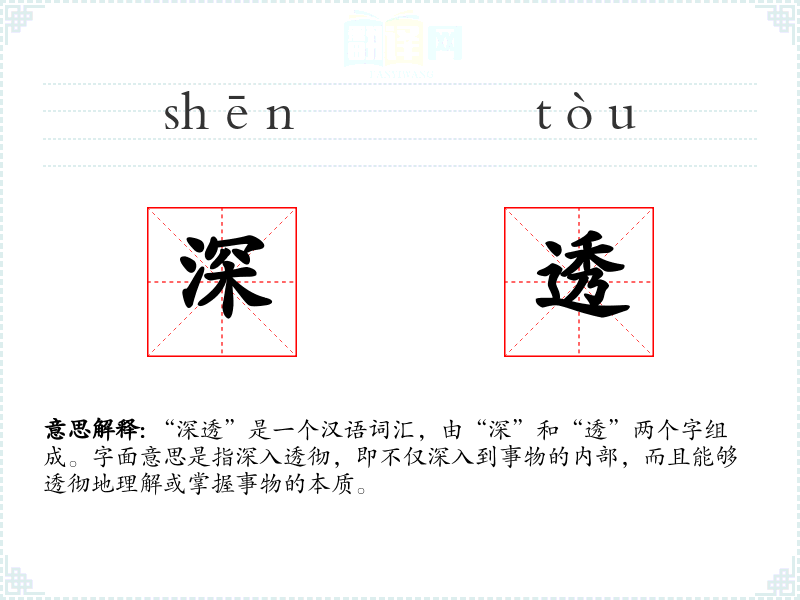 “深透”是一个汉语词汇,由“深”和“透”两个字组成。字面意思是指深入透彻,即不仅深入到事物的内部,而且能够透彻地理解或掌握事物的本质。