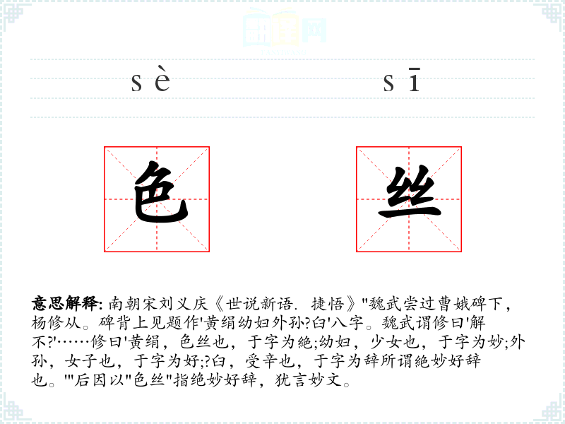 1.南朝宋刘义庆《世说新语.捷悟》"魏武尝过曹娥碑下,杨修从。碑背上见题作'黄绢幼妇外孙?臼'八字。魏武谓修曰'解不?'……修曰'黄绢,色丝也,于字为絶;幼妇,少女也,于字为妙;外孙,女子也,于字为好;?臼,受辛也,于字为辞所谓絶妙好辞也。'"后因以"色丝"指绝妙好辞,犹言妙文。