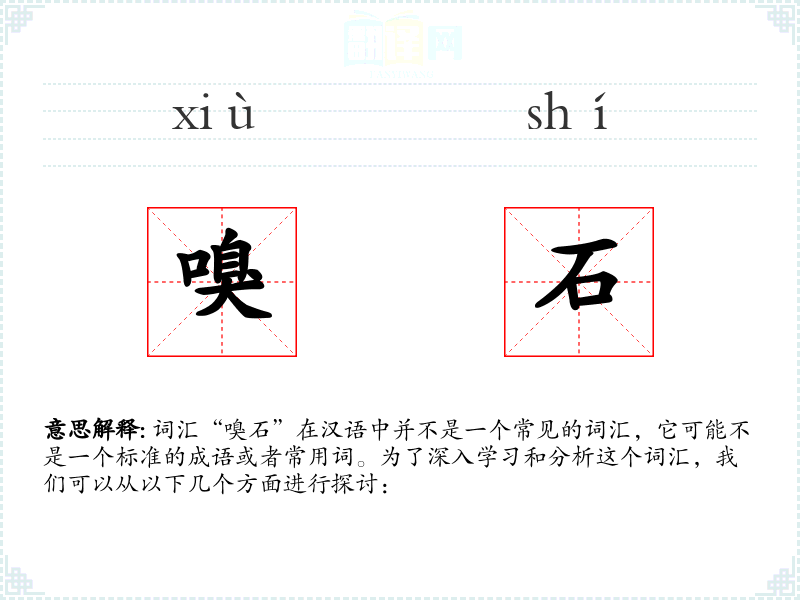 词汇“嗅石”在汉语中并不是一个常见的词汇,它可能不是一个标准的成语或者常用词。为了深入学习和分析这个词汇,我们可以从以下几个方面进行探讨: