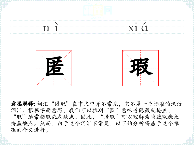 词汇“匿瑕”在中文中并不常见,它不是一个标准的汉语词汇。根据字面意思,我们可以推测“匿”意味着隐藏或掩盖,“瑕”通常指瑕疵或缺点。因此,“匿瑕”可以理解为隐藏瑕疵或掩盖缺点。然而,由于这个词汇不常见,以下的分析将基于这个推测的含义进行。