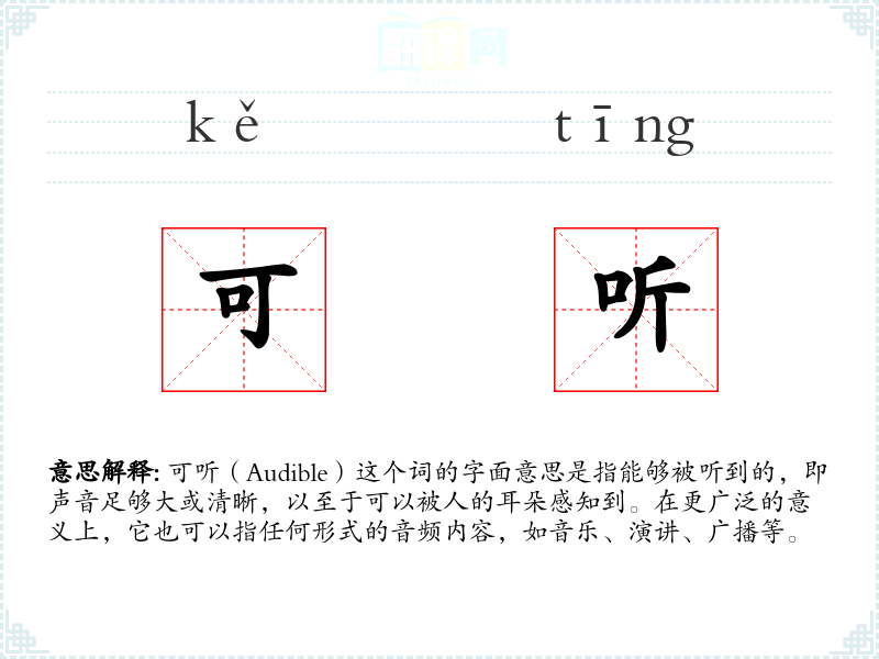 可听(Audible)这个词的字面意思是指能够被听到的,即声音足够大或清晰,以至于可以被人的耳朵感知到。在更广泛的意义上,它也可以指任何形式的音频内容,如音乐、演讲、广播等。