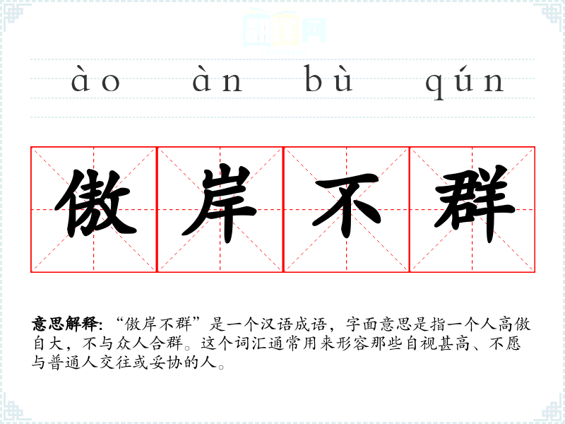 “傲岸不群”是一个汉语成语,字面意思是指一个人高傲自大,不与众人合群。这个词汇通常用来形容那些自视甚高、不愿与普通人交往或妥协的人。