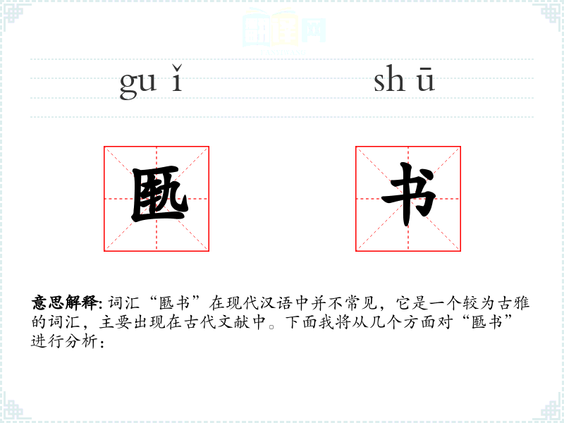 词汇“匦书”在现代汉语中并不常见,它是一个较为古雅的词汇,主要出现在古代文献中。下面我将从几个方面对“匦书”进行分析: