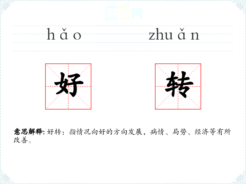 “好转”一词由“好”和“转”组成,“好”表示好的方向,“转”表示变化。在古代汉语中,“转”已有变化的意思,如“转机”,“好转”则是近代汉语中形成的词汇,用以描述向好的方向变化。